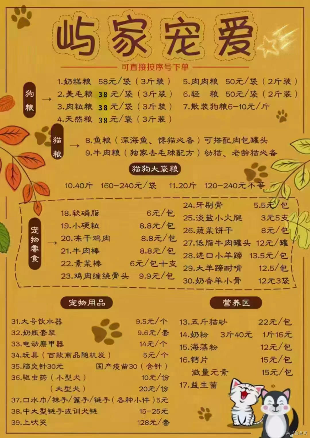2.美毛粮 38元/袋 3斤(微量元素,馋嘴) 5.肉肉粮 50元/袋 2斤(肉粒粮超级加倍更细腻+冻干,蛋白,补肉日常)