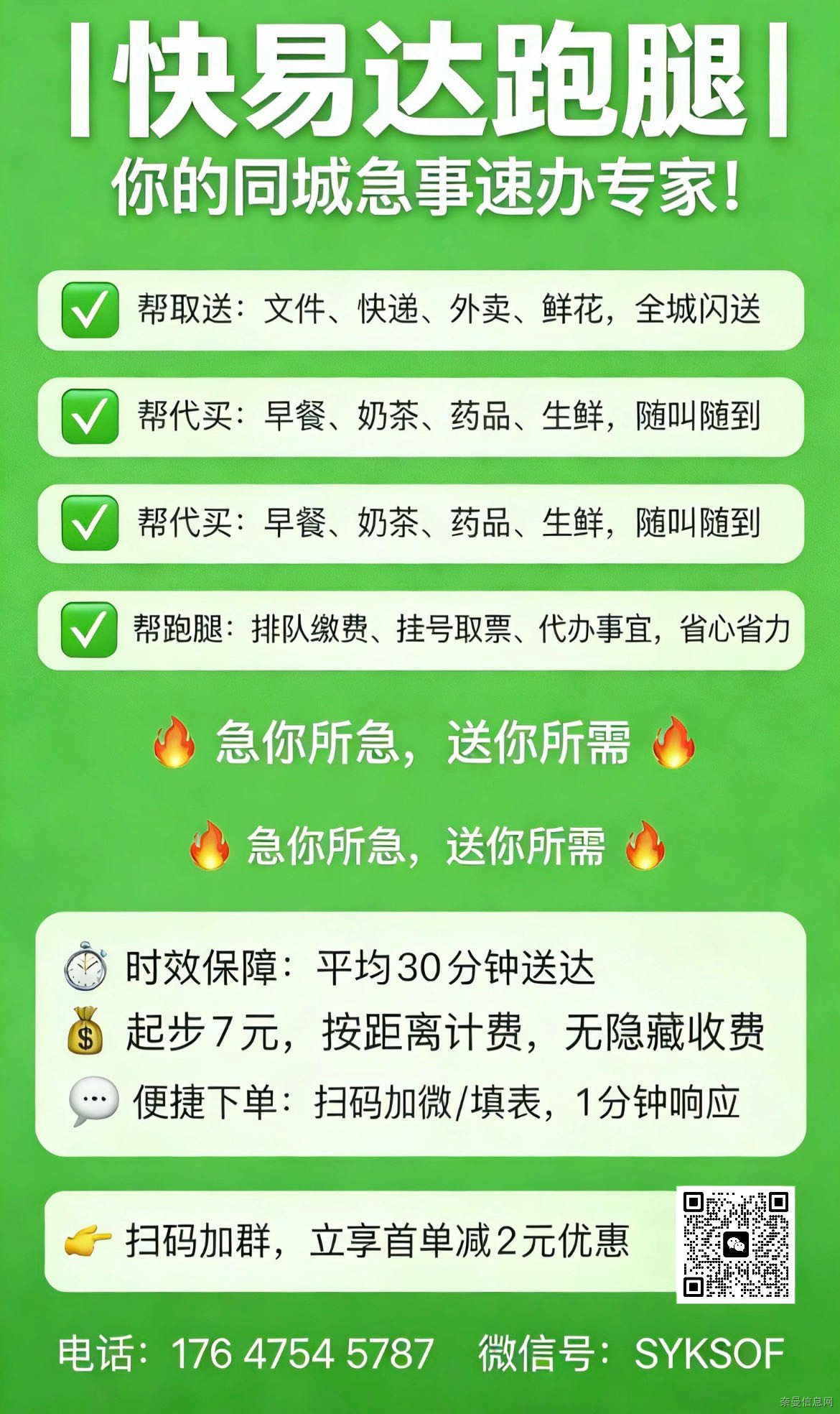 奈曼快易达跑腿上线啦~首单5元起步,帮你解决跑腿琐事,全城快速响应,有需要直接喊我!